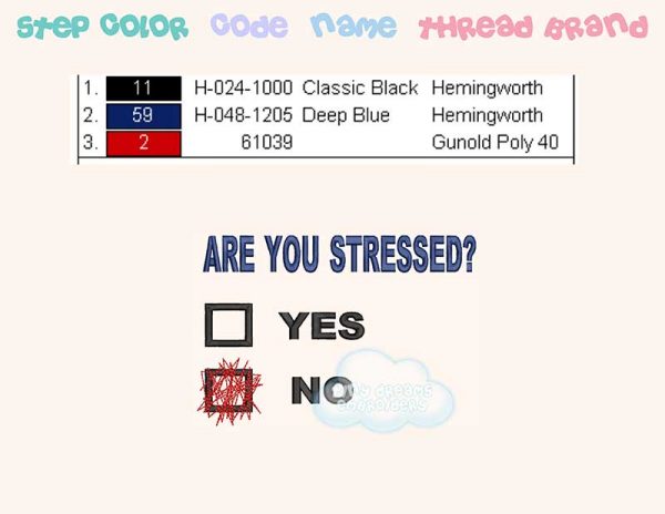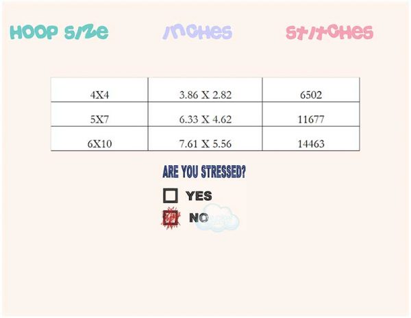 The design comes in the following formats: PES, DST, EXP, HUS, JEF, VIP, VP3, XXX
