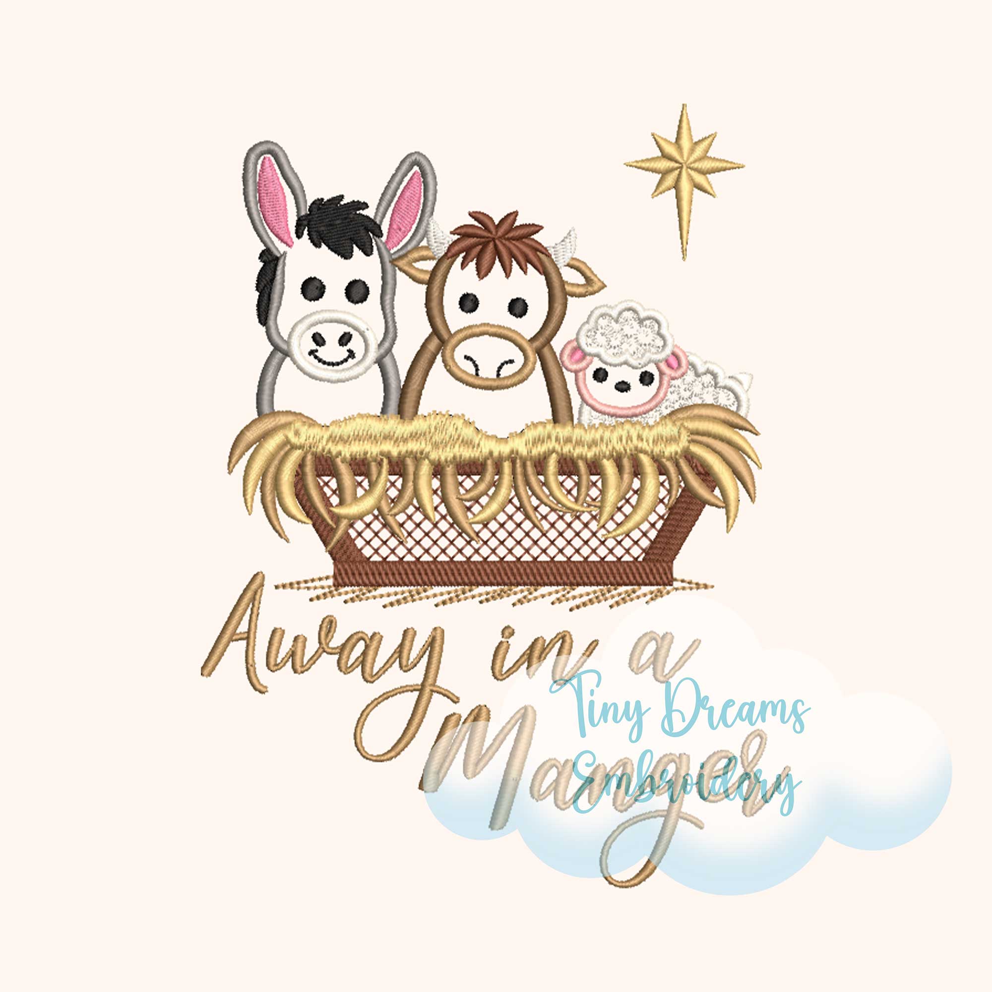 Bring the true spirit of Christmas to life with this Away in a Manger Animal Nativity Scene Embroidery Design featuring a sweet depiction of Baby Jesus surrounded by a gentle mule and ox. 🐂🐴✨ Perfect for adding a heartfelt touch to holiday garments, decor, stockings, or gifts. This design is provided as a digital download for instant stitching with your embroidery machine.