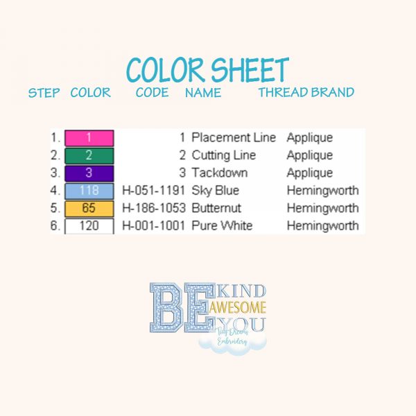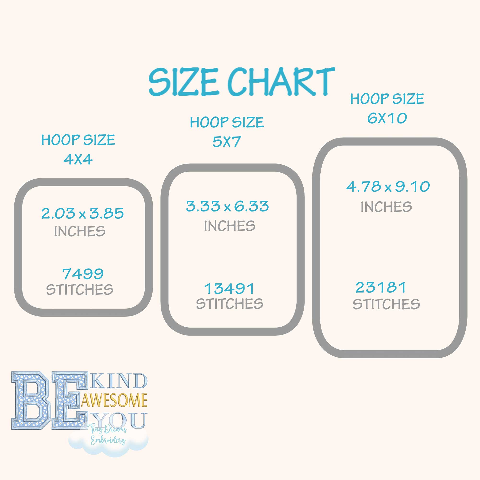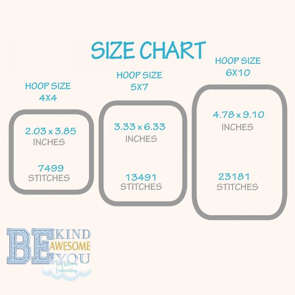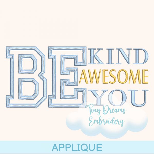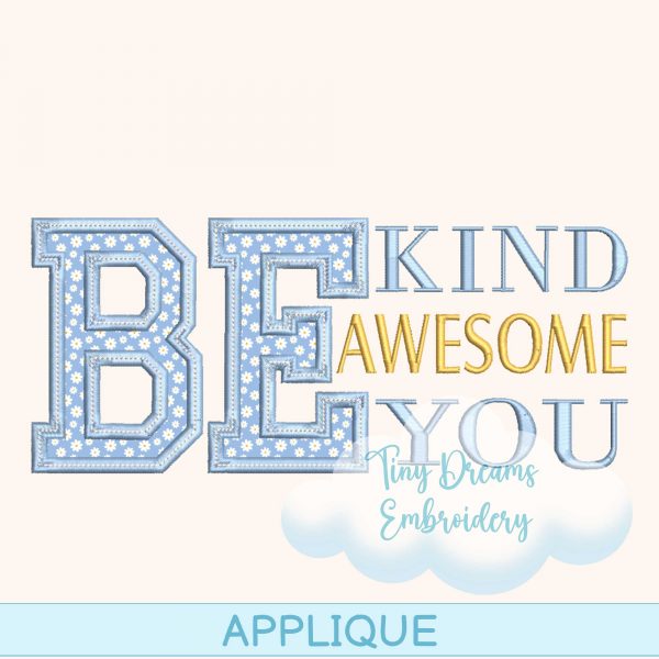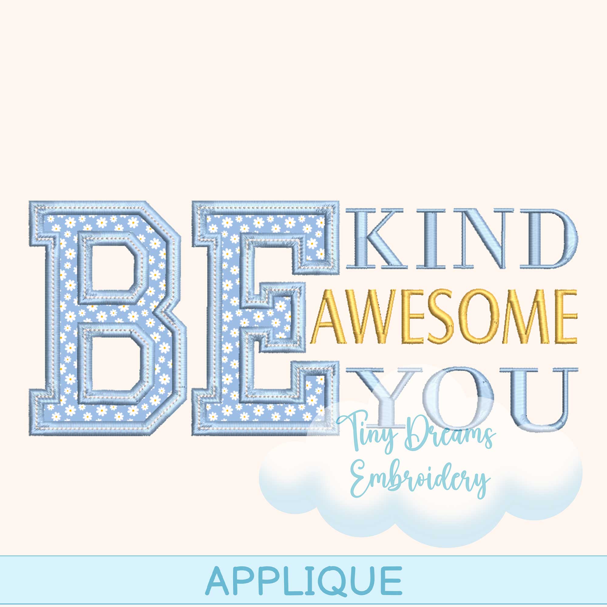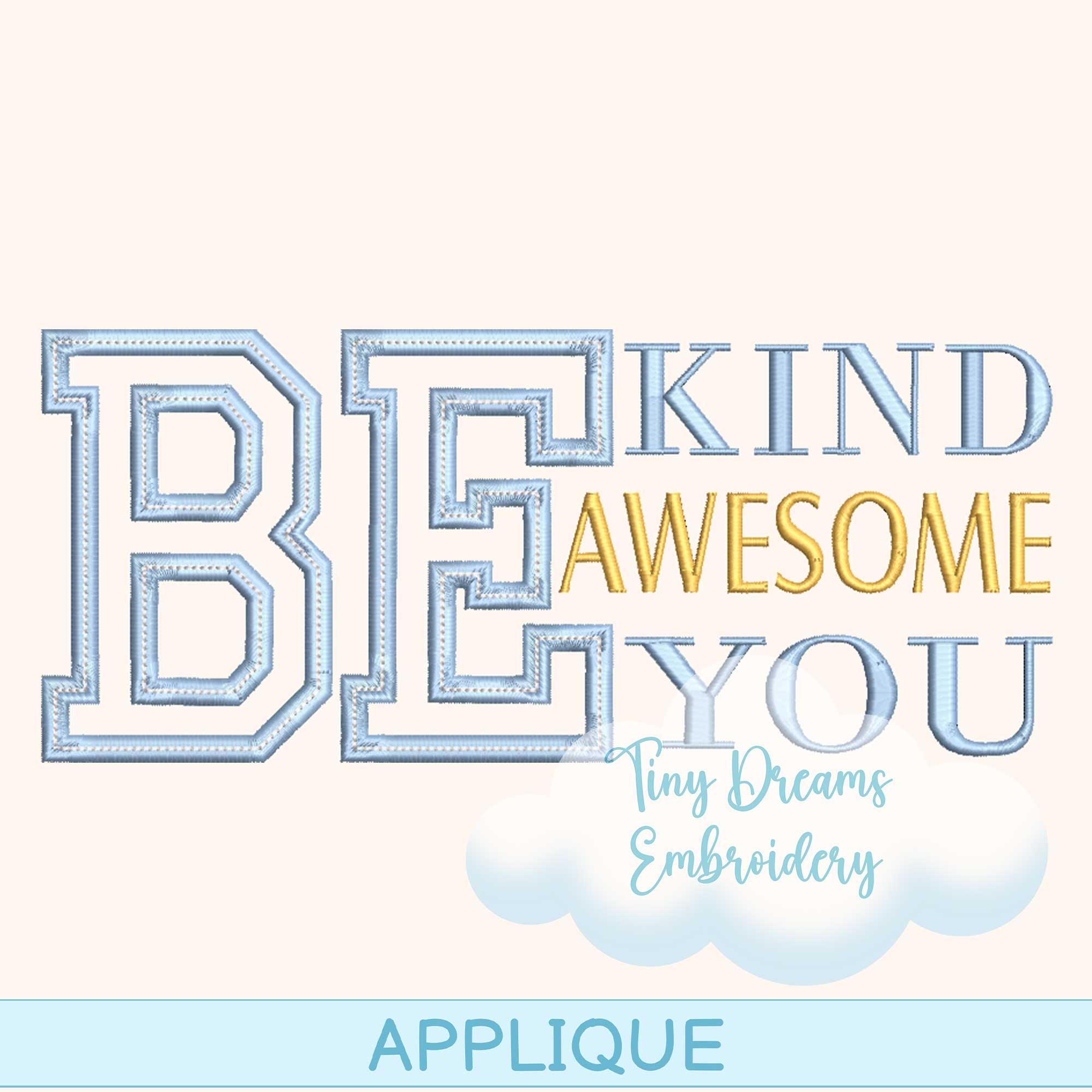 The Be Kind digital machine embroidery design features uplifting messages like Be Awesome, Be You, and Be Yourself in charming applique styles. Perfect for adding positivity and personality to clothing, accessories, or gifts.