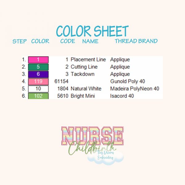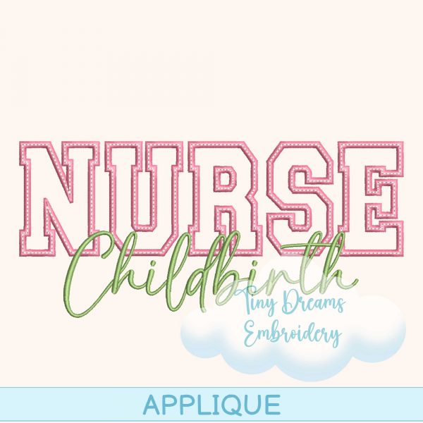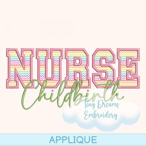 The childbirth nurse digital machine embroidery design features a charming applique for a newborn baby. This medical nurse embroidery design is perfect for nurse-themed projects and appliques.