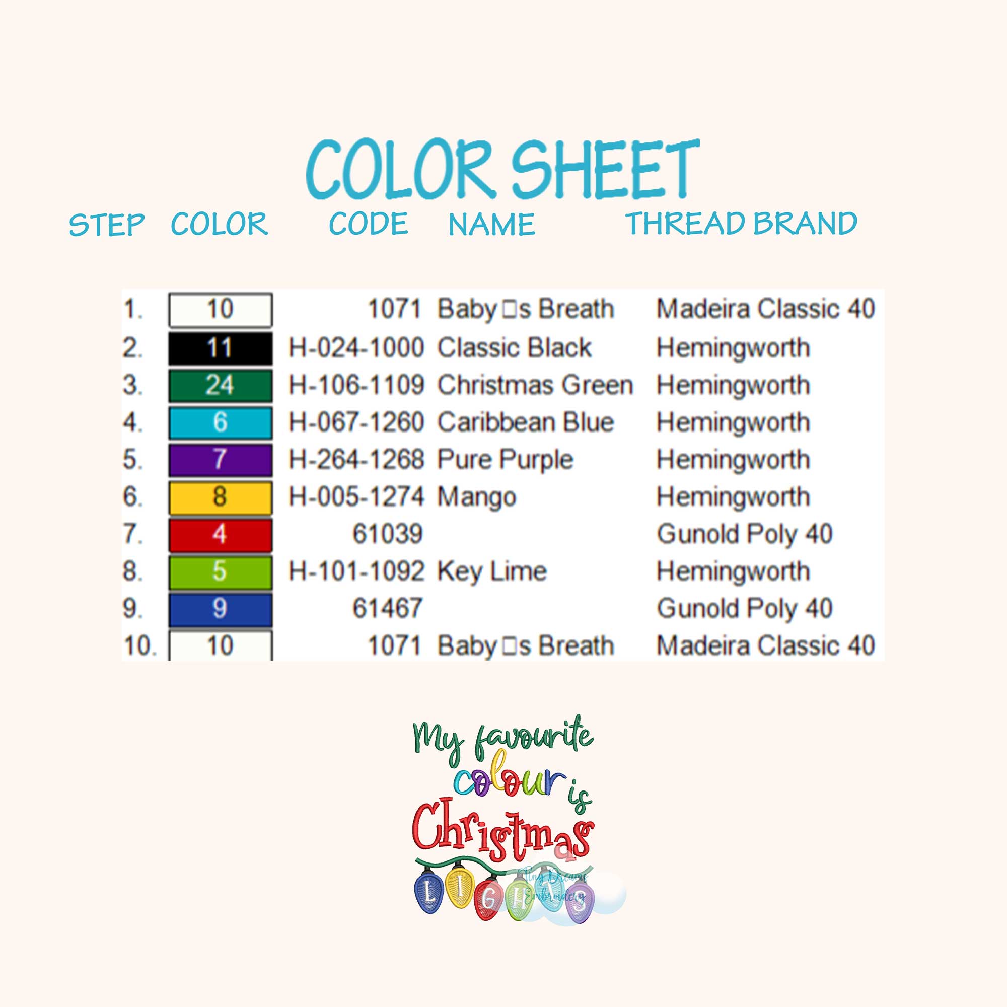 The “Christmas Lights” digital machine embroidery design, coupled with the festive charm of the “Favourite” embroidery design, captures the joyous spirit of the holiday season. Illuminated by the vibrant “Colour Ornament” embroidery, this collection adds a delightful touch to festive creations, infusing them with the warmth and brilliance of Christmas lights.