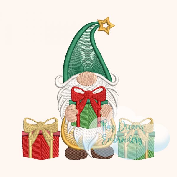Infuse the holiday spirit into your crafts with the Christmas Gnome Digital Embroidery Machine Design, portraying the joyful essence of the season. This adorable gnome, bearing a Christmas present, adds a touch of festive charm, making it a perfect addition to your projects adorned with stars and warmth.