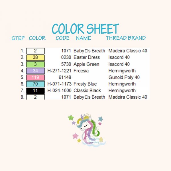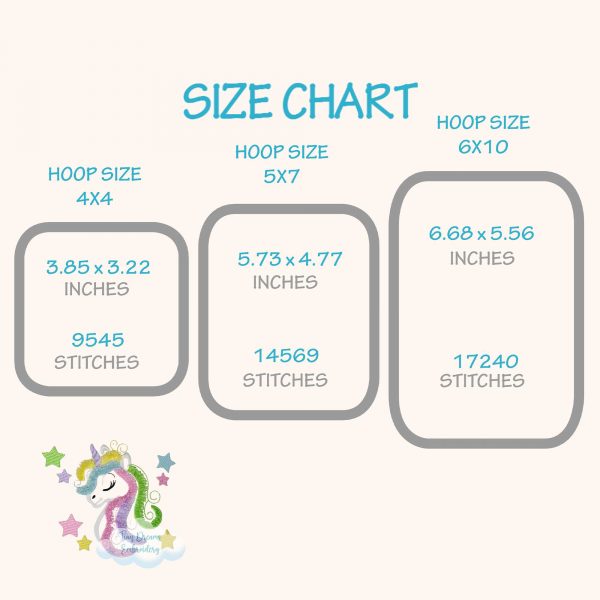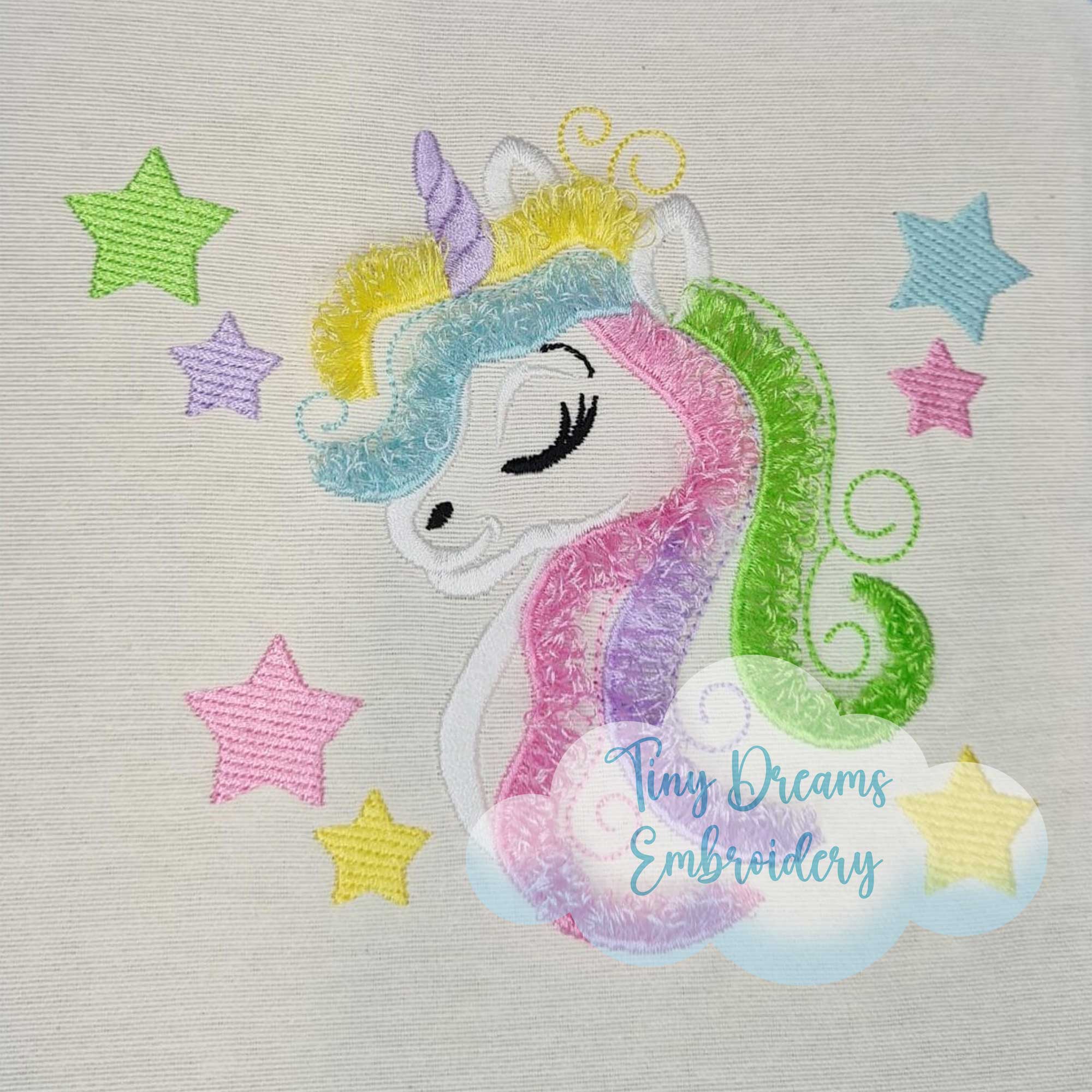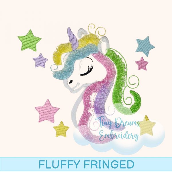 This adorable digital machine embroidery design features a cute, fluffy fringed unicorn, perfect for baby girl nursery projects that evoke the magic of unicorns. Ideal for adding whimsical charm to your embroidery creations with a magical touch.