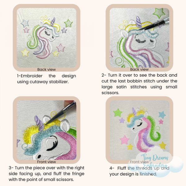 2- Turn it over to see the back and cut the last bobbin stitch under the large satin stitches using small scissors. Cut only those parts that are shown in the picture as fringes.