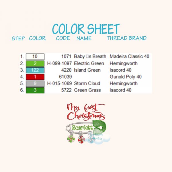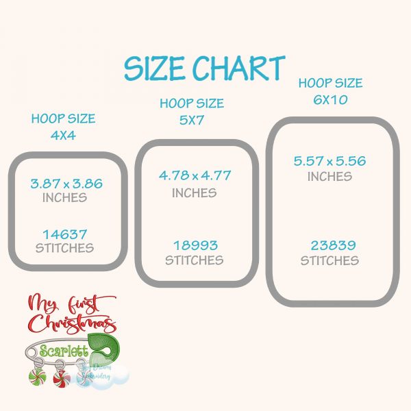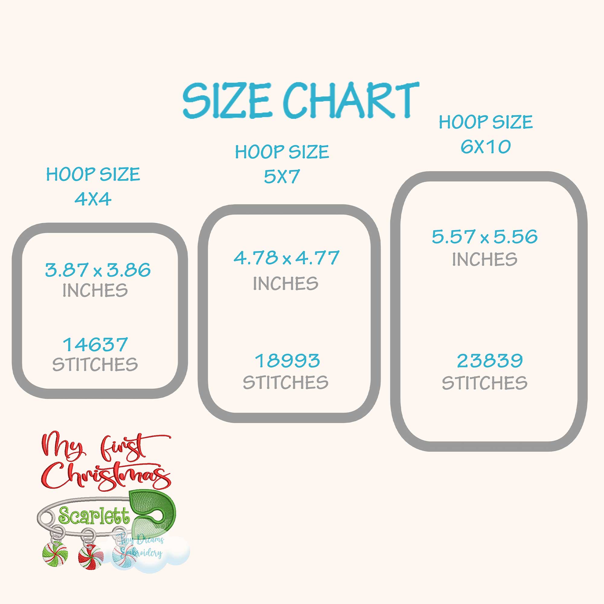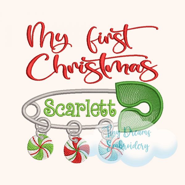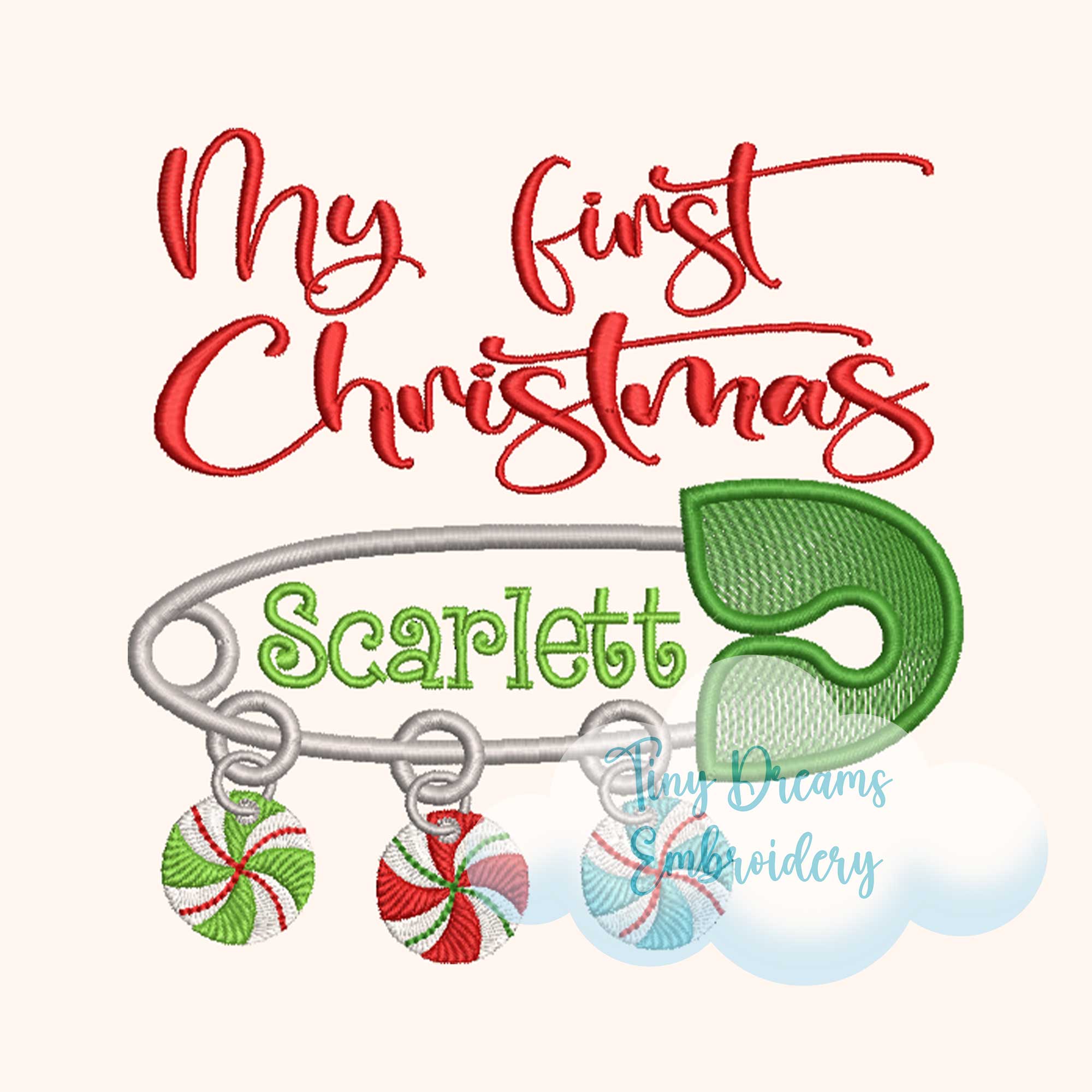 This First Christmas digital machine embroidery design features a baby safety pin and customizable monogram, perfect for creating a personalized keepsake. Add a festive touch with a peppermint candy accent and your baby’s name to celebrate their first Christmas.