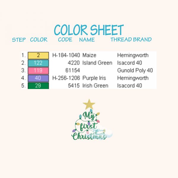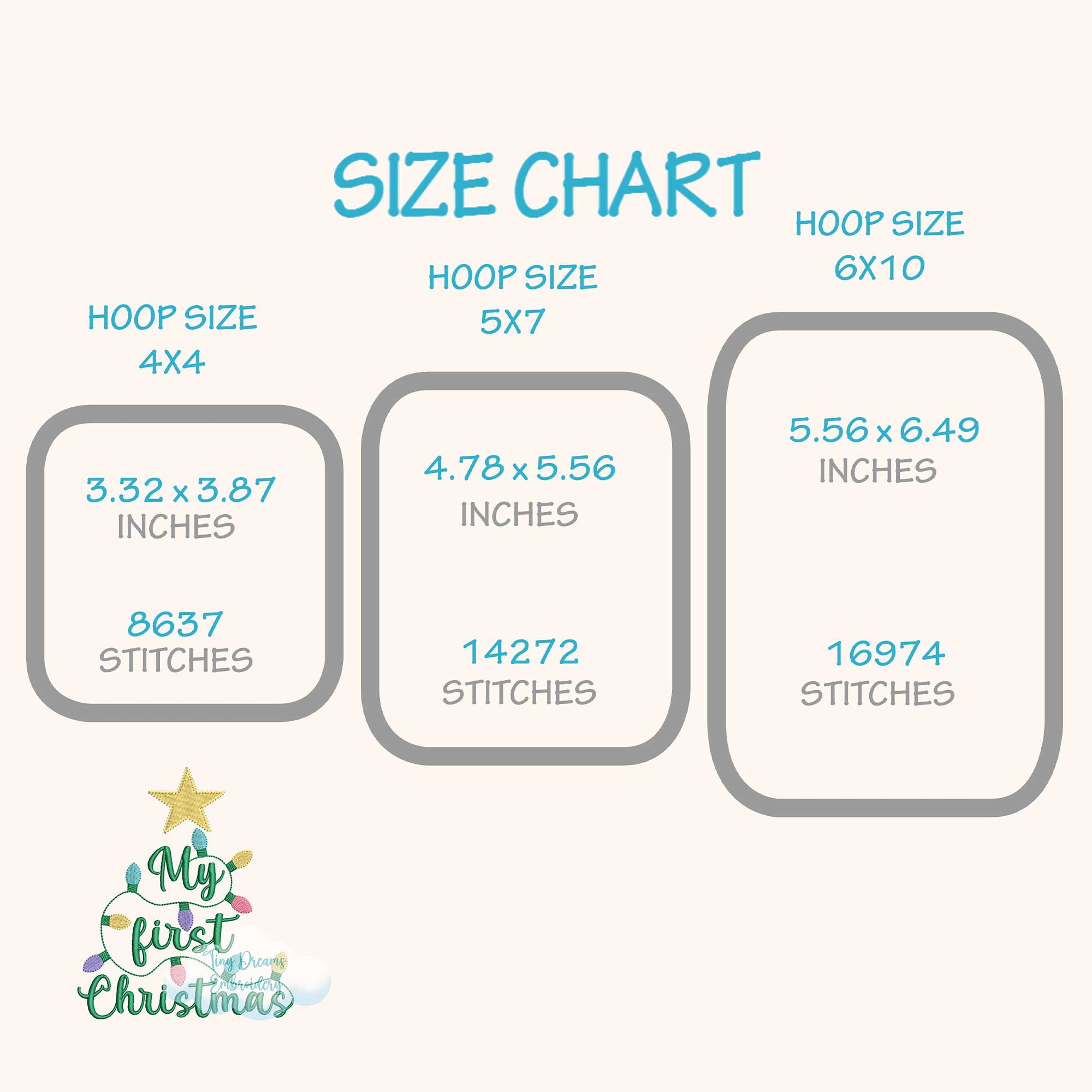 This First Christmas digital machine embroidery design features a charming Christmas tree with star lights, perfect for celebrating a baby’s first holiday. Add a festive and heartwarming touch to your seasonal projects with this special design.