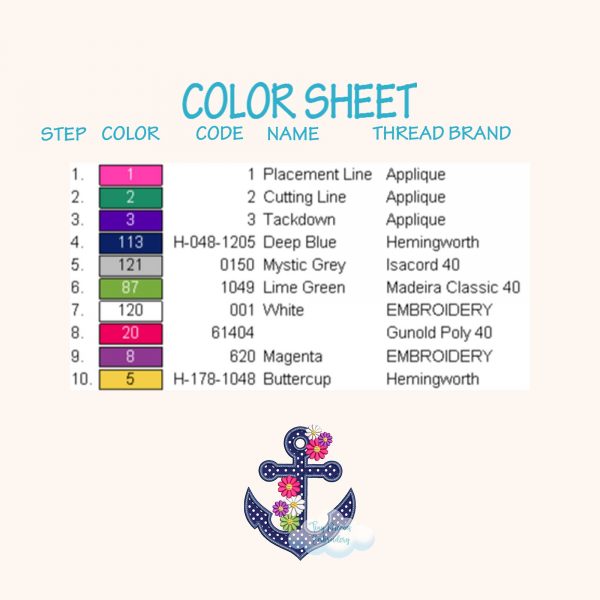 ☁️ The size chart (hoops, sizes and stitches) and color sheet appear on the left side of the image when you click on it.