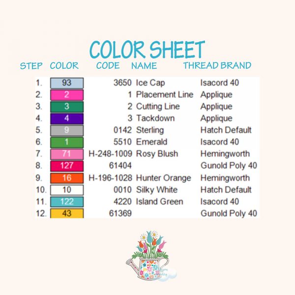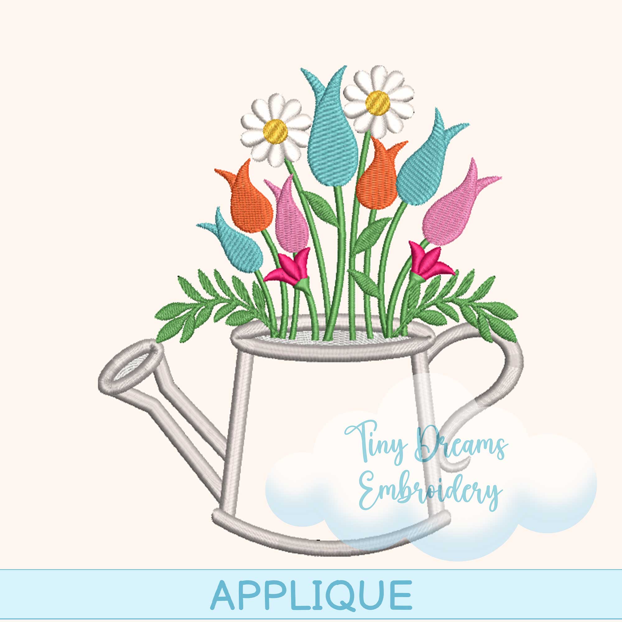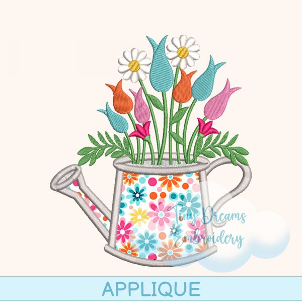 This digital machine embroidery design includes a floral applique featuring a charming flower spring watering can motif adorned with daisies and tulips. Ideal for adding a delightful touch of spring and nature to your embroidery projects.