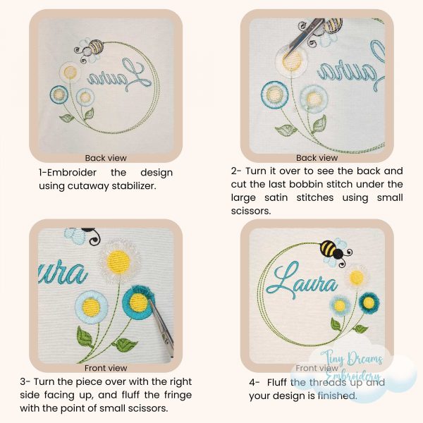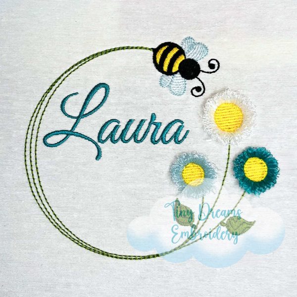 These digital machine embroidery designs feature a fringed floral bee motif and a custom monogram with fluffy chenille flowers, offering personalized and charming options for your embroidery projects.