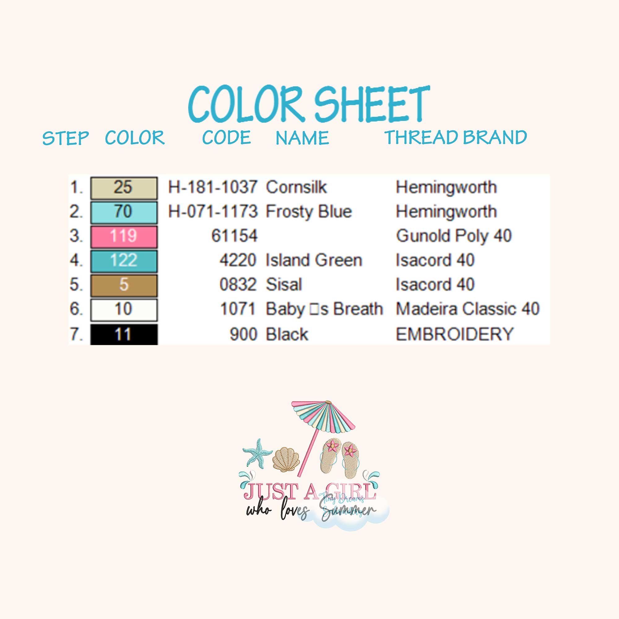 This cheerful embroidery design captures a girl’s love for summer with flip-flops, seashells, and a beach-inspired theme. Perfect for adding a sunny touch to any summer season project!