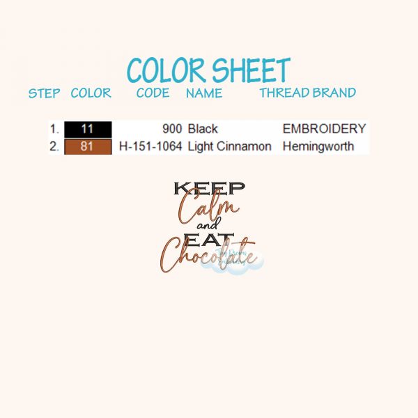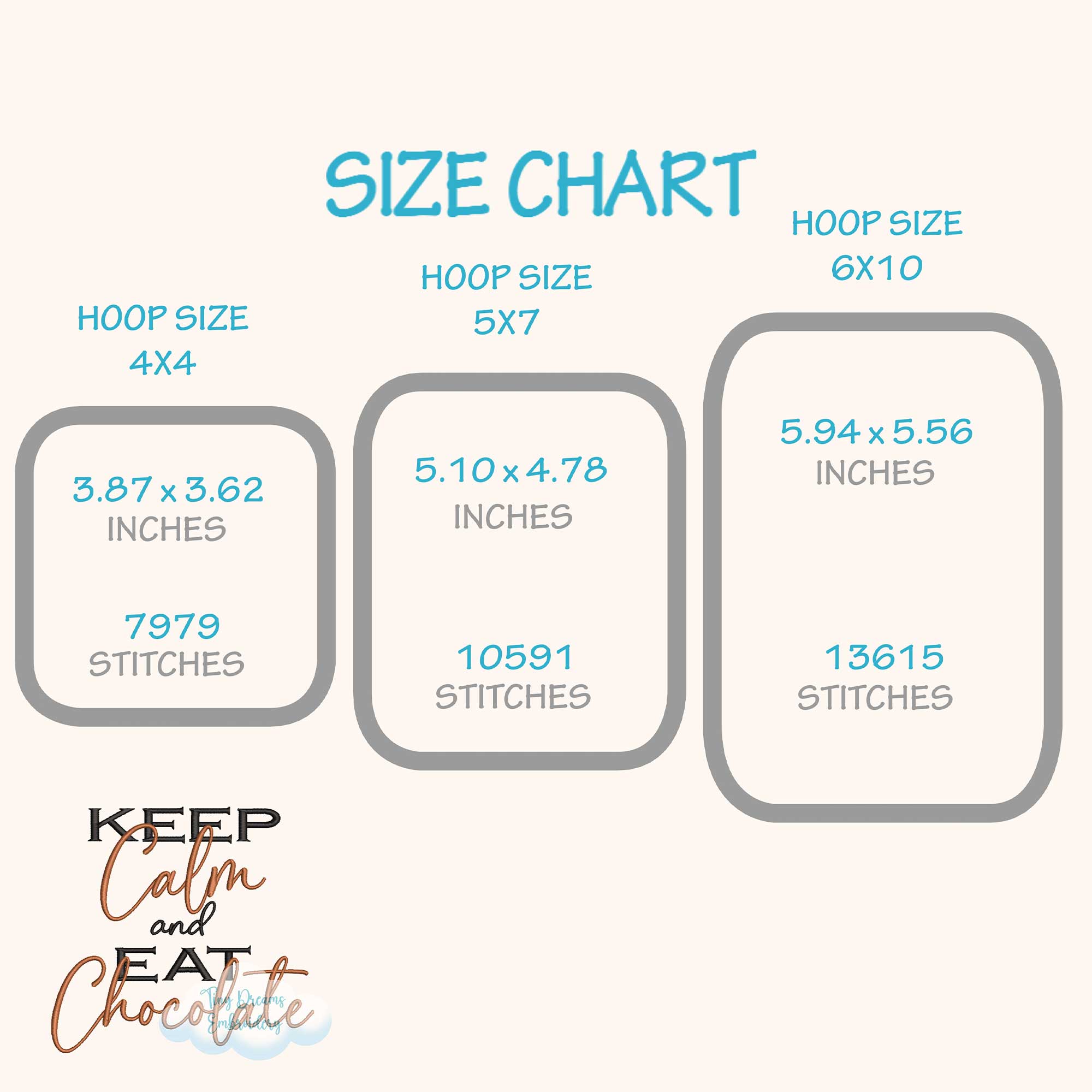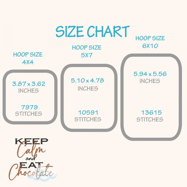 Indulge your sweet side with this digital machine embroidery design featuring “Keep Calm and Eat Chocolate.” Perfect for reading pillows or kitchen-themed projects, it’s a delightful addition for chocolate lovers.