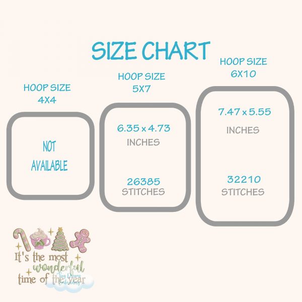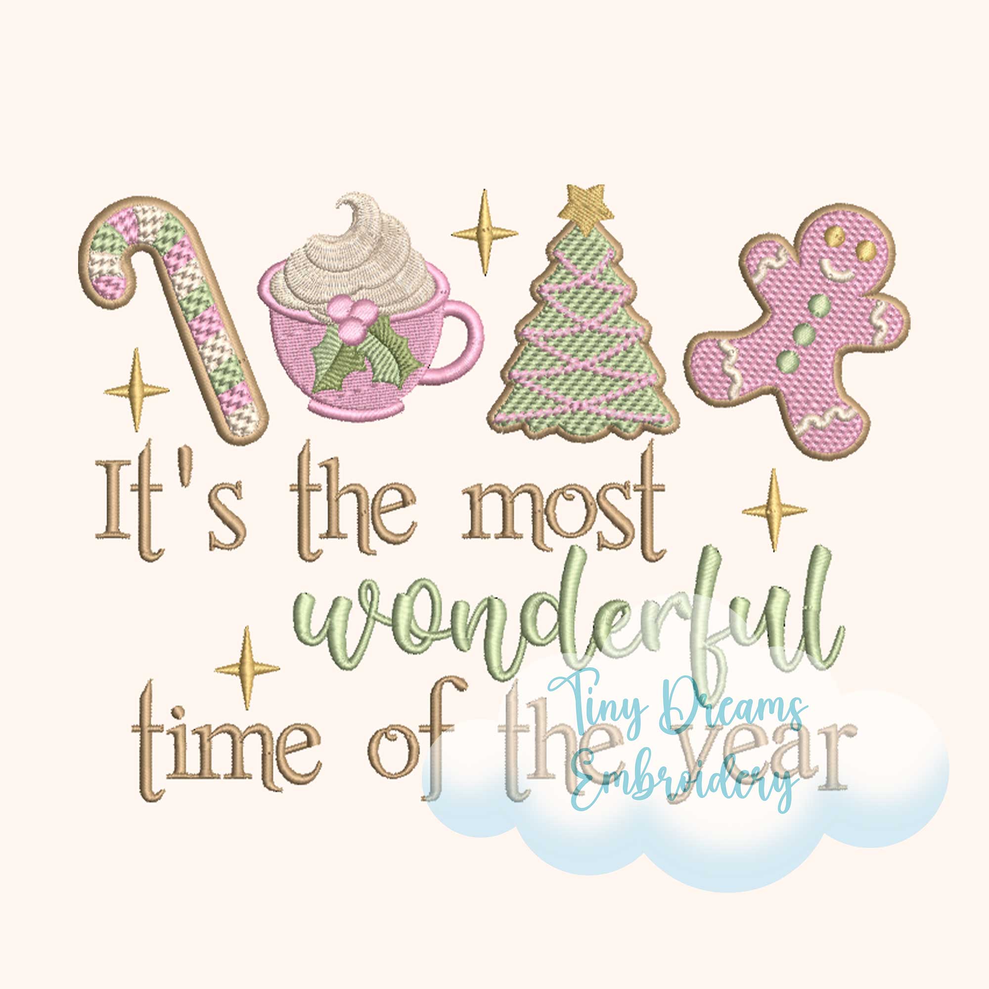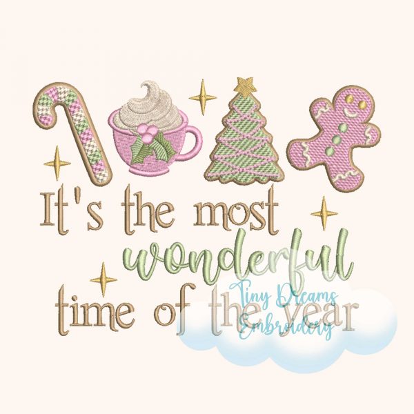 Celebrate the holidays with this Most Wonderful Time of the Year Embroidery Design, featuring candy canes, gingerbread cookies, hot cocoa, and a Christmas tree. Instantly download this Christmas machine embroidery design for festive and joyful projects 🎄🍪