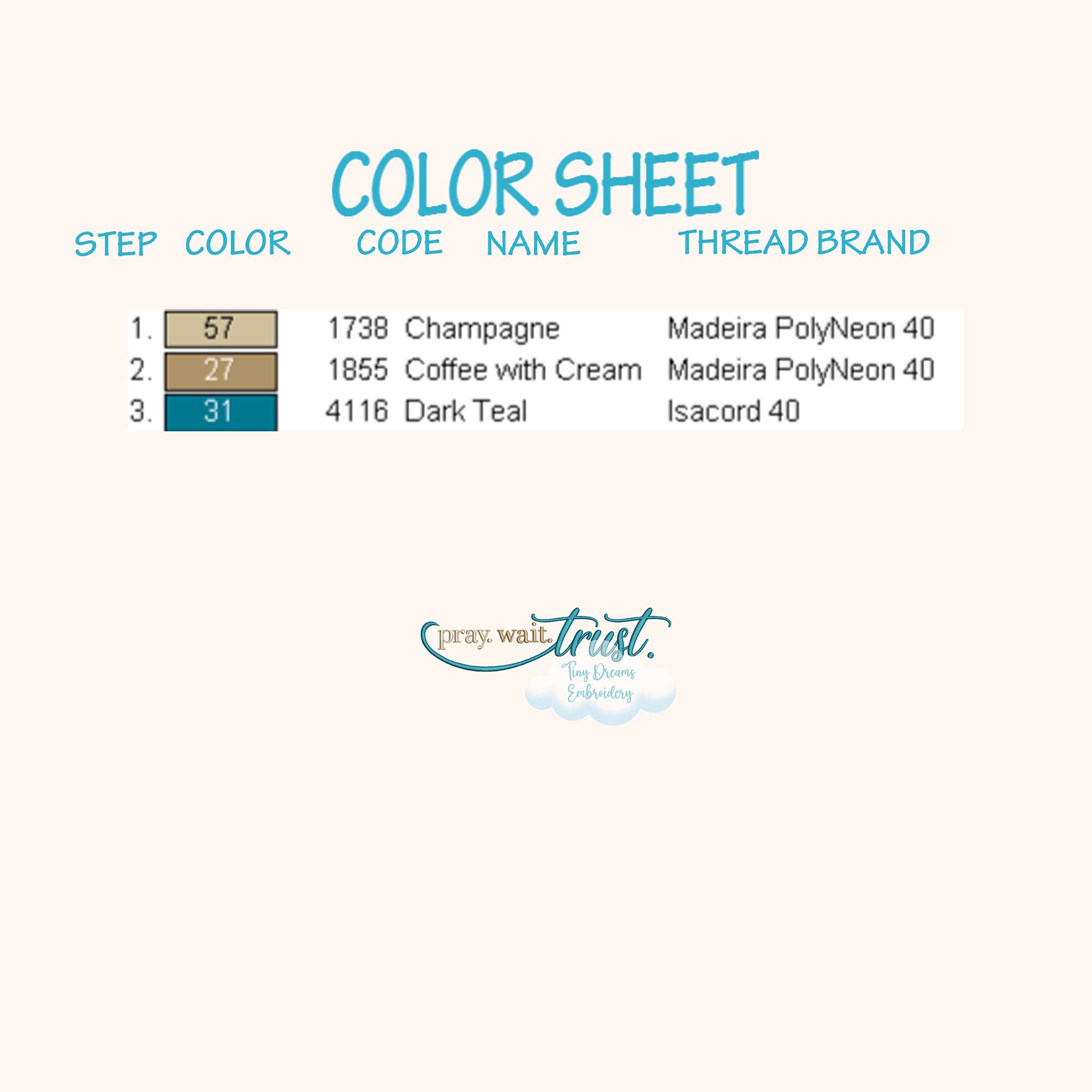 Embrace the power of faith with our ‘Pray, Wait, Trust’ machine embroidery design. This intricate design beautifully encapsulates the essence of Christian spirituality, reminding us to trust in the divine path. With its religious symbolism, it’s a meaningful addition to any embroidery project, perfect for those seeking solace and connection with their faith.