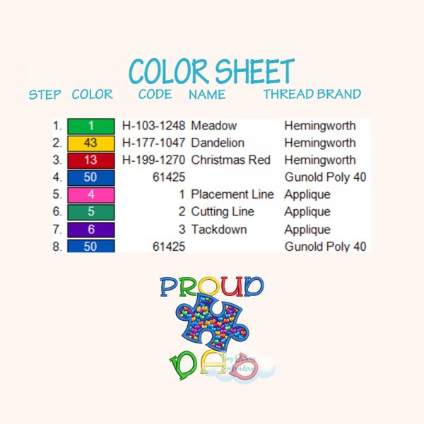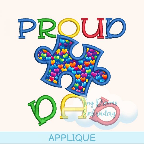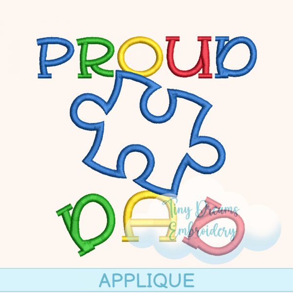 Honor paternal pride with a poignant digital machine embroidery design, incorporating an autism awareness puzzle piece appliqué, symbolizing the strength and love of a proud dad.