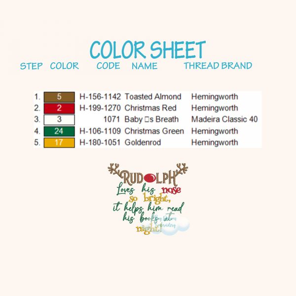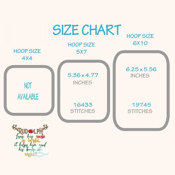 This Rudolph Read Book digital machine embroidery design features a festive reindeer enjoying a book, perfect for creating a cozy Christmas reading pillow. Add a playful touch to your holiday projects with this charming reindeer embroidery design.
