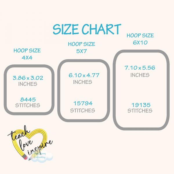 Our collection features the “Teach Love Inspire” digital machine embroidery design and the “Teacher Love Heart” embroidery design. Additionally, we offer a delightful “Pencil Heart” design, perfect for school and class-themed projects.