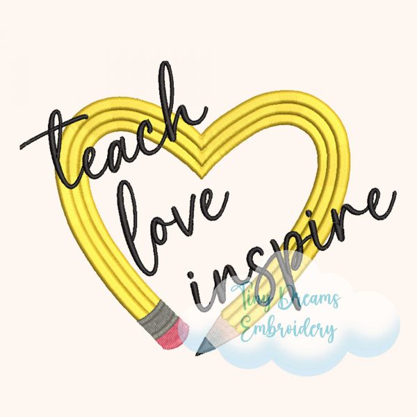Teach Love Inspire Digital Machine Embroidery Design Teacher Love Heart Embroidery Design Pencil Heart Design Embroidery School Class Design