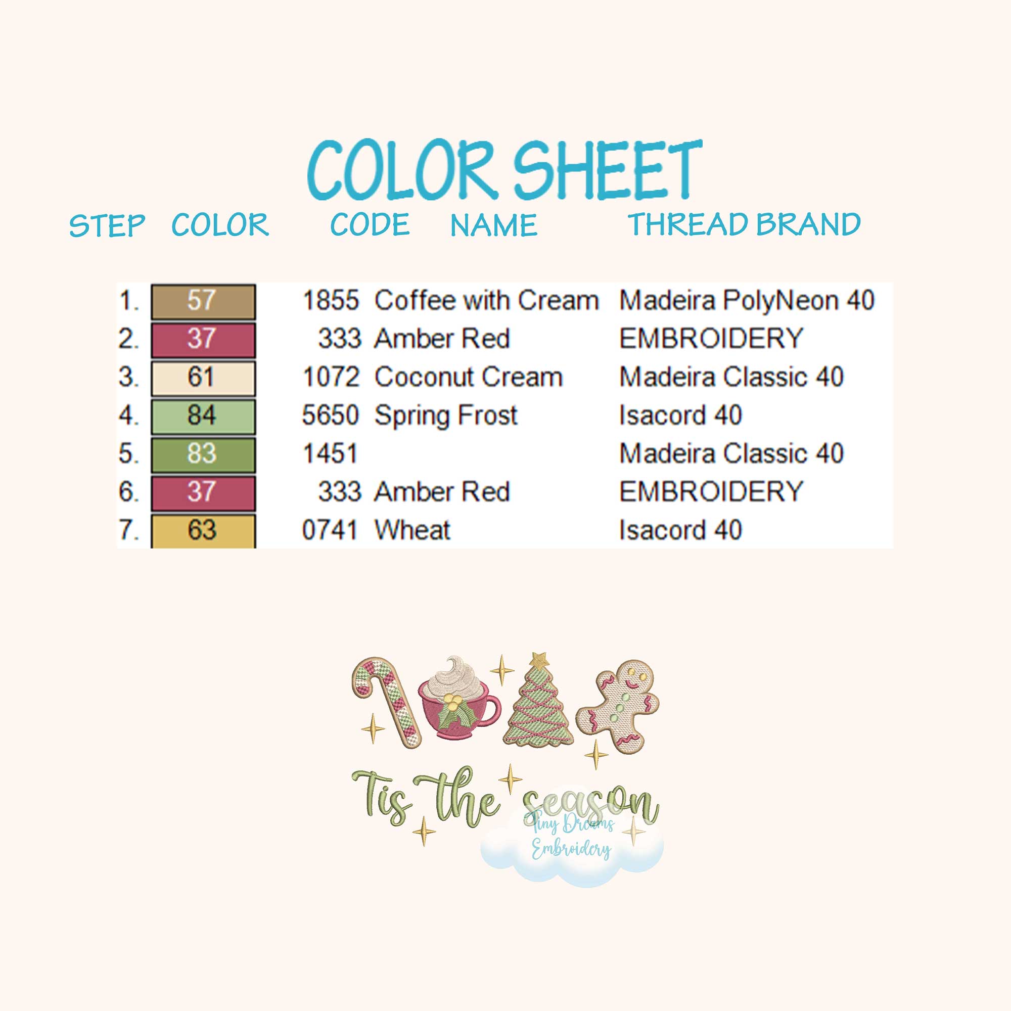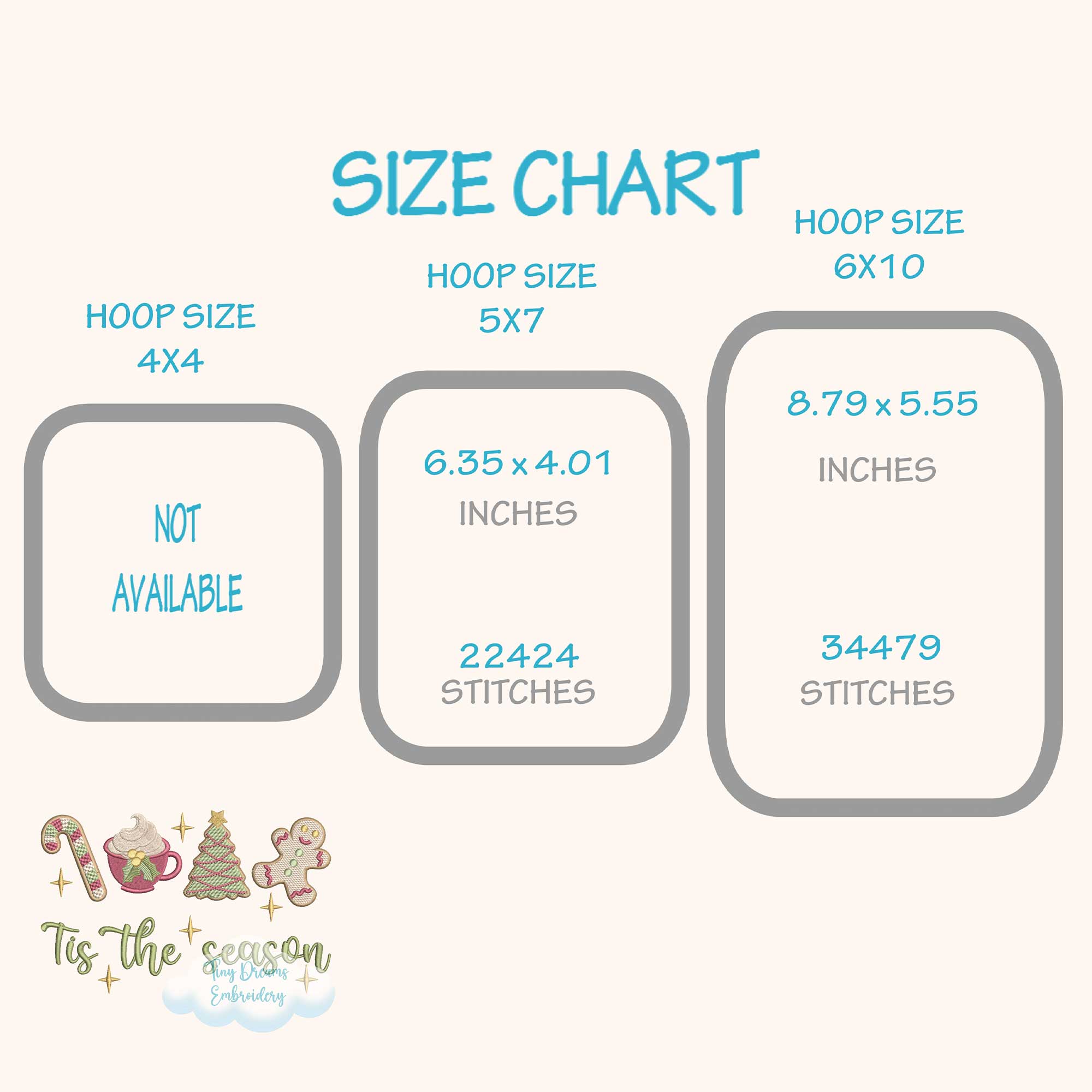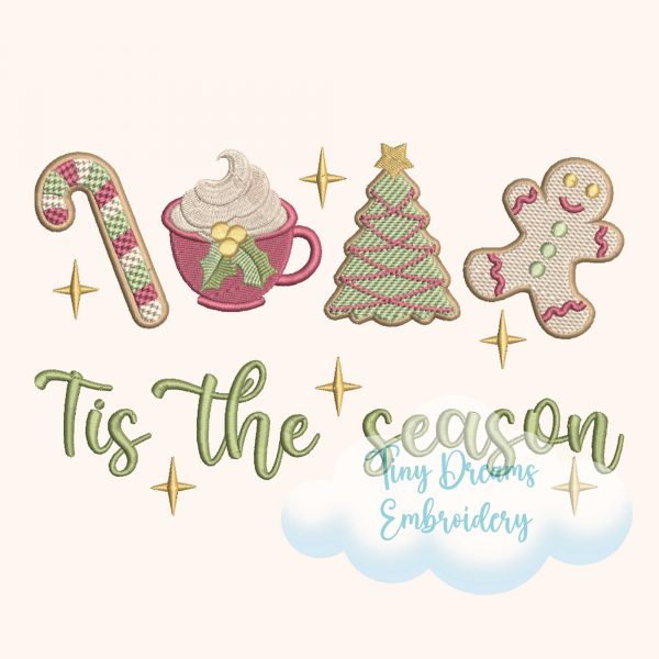 Spread holiday cheer with this ’Tis The Season Christmas Embroidery Design, featuring candy canes, gingerbread cookies, hot cocoa, and a Christmas tree. Instantly download this machine embroidery design for festive seasonal projects 🎄🍪
