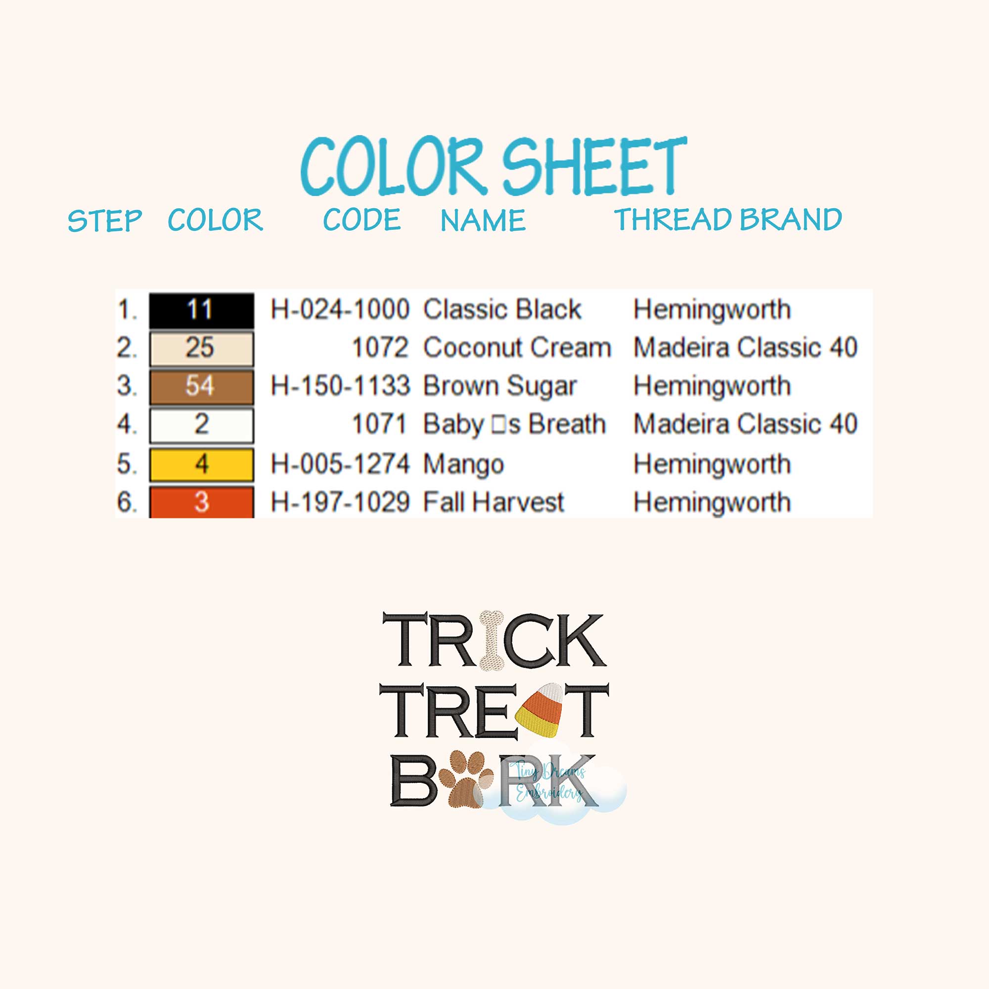 ☁️ The size chart (hoops, sizes and stitches) and color sheet appear on the left side of the image when you click on it.