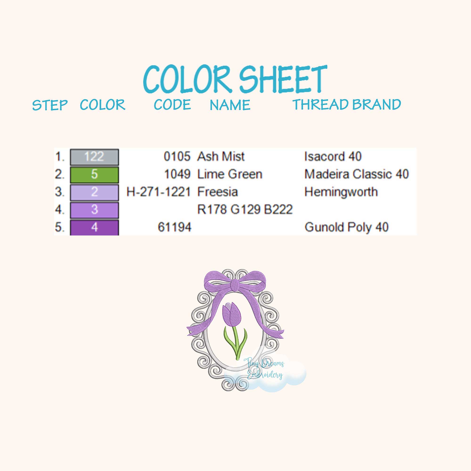 This digital machine embroidery design showcases a tulip flower cameo with a graceful border and bow. Perfect for spring projects, it brings floral elegance with detailed tulip embroidery accents. 🌷🎀✨🌸
