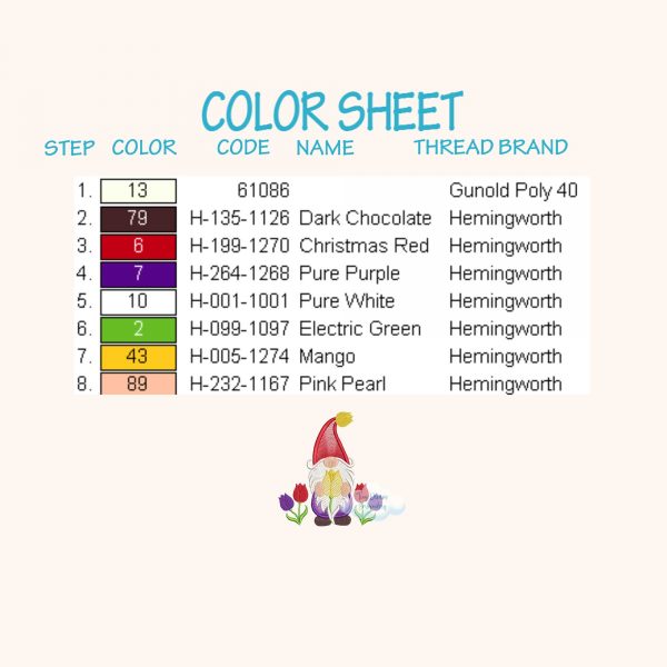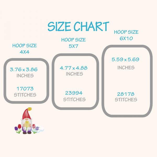 Welcome the beauty of spring into your embroidery projects with our Spring Gnome digital machine embroidery design. This charming design showcases a Floral Gnome surrounded by intricate Tulip embroidery, capturing the essence of the season in every stitch.
