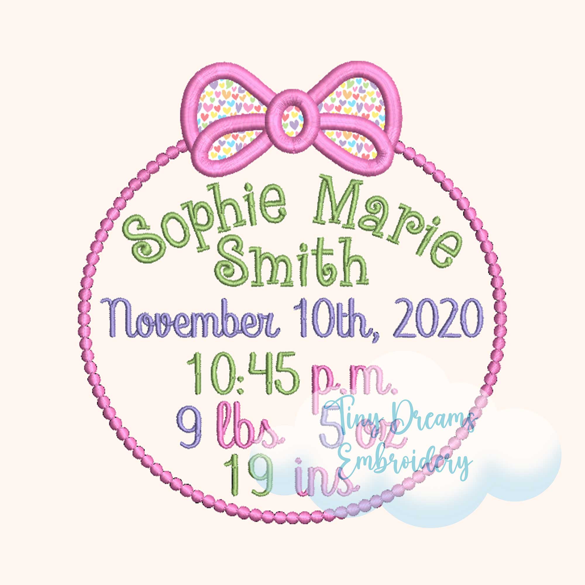 Coquette Bow Birth Announcement Applique Digital Machine Embroidery Design Newborn Baby Girl Ribbon Applique Design Embroidery Girl Birth