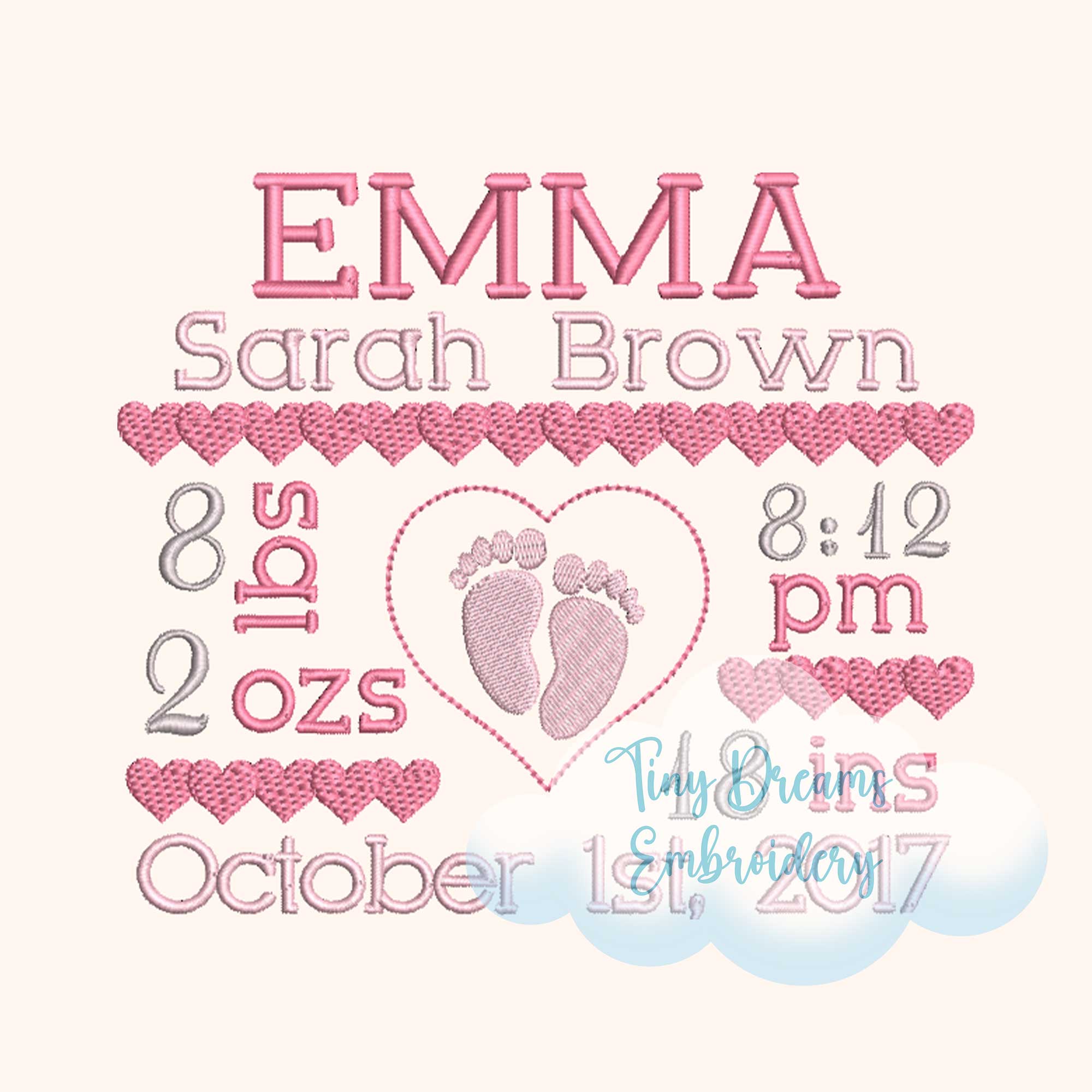 Baby Footprint Birth Announcement Digital Machine Embroidery Design Baby Girl Newborn Embroidery Design Personalized Baby Announcement Heart