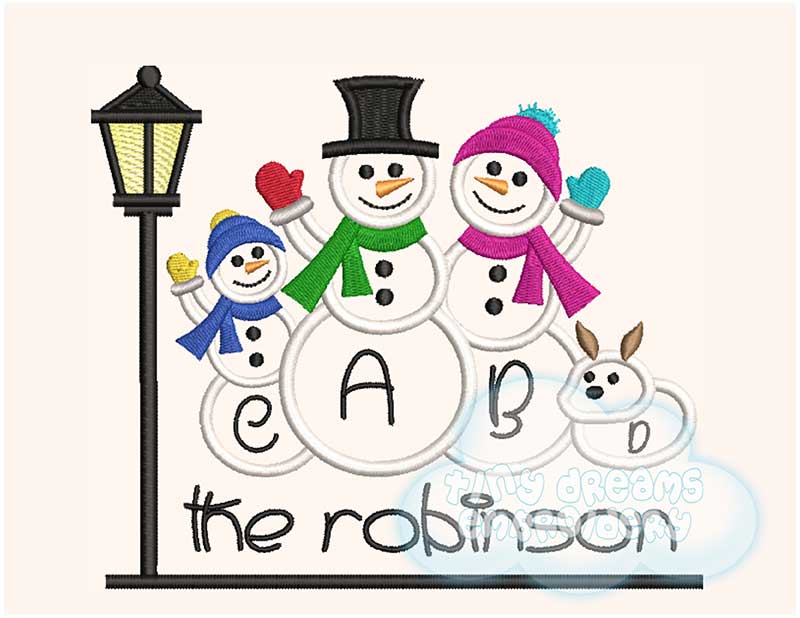 Snowman family of 4 with a dog monogram/name (name/monogram/font not included) embroidery design