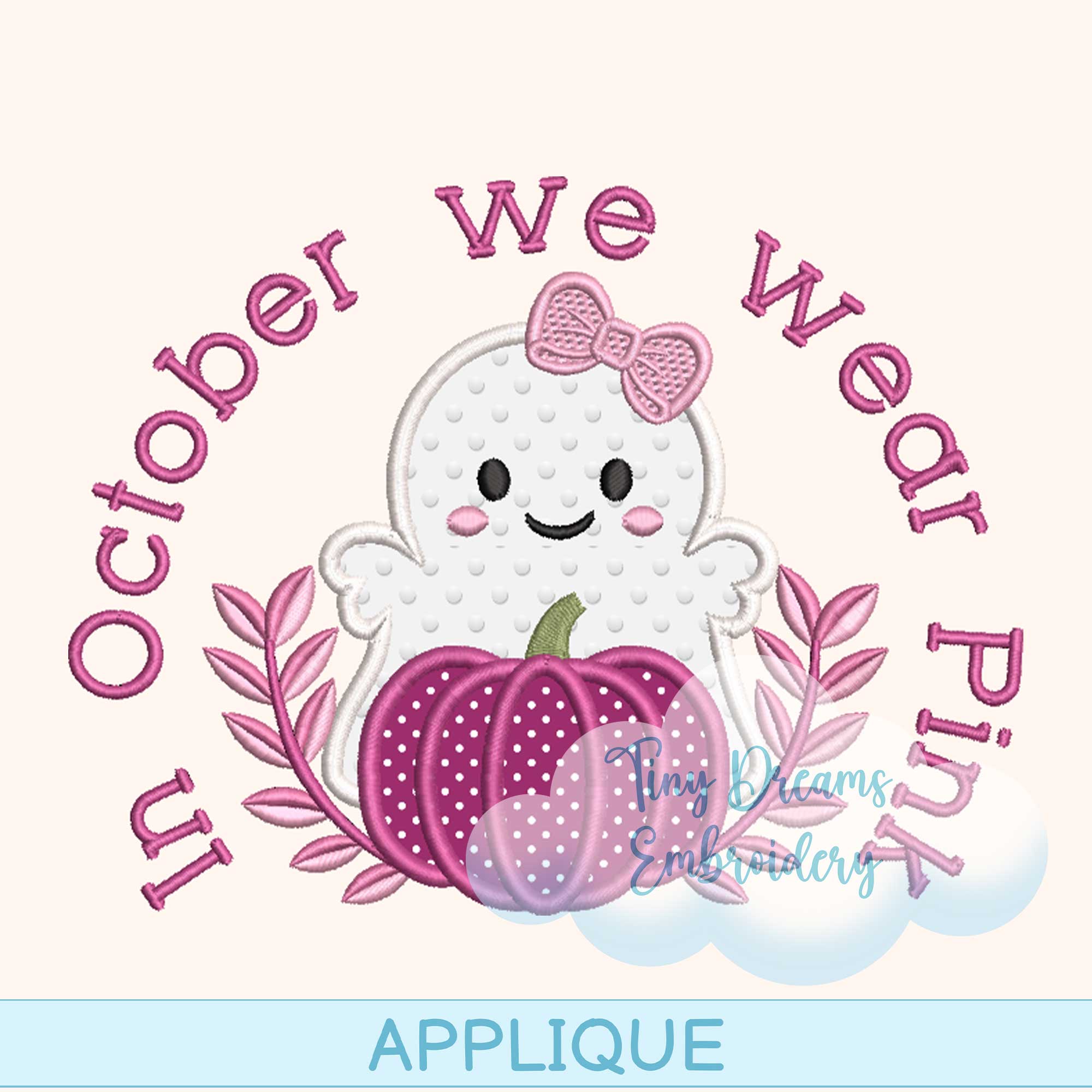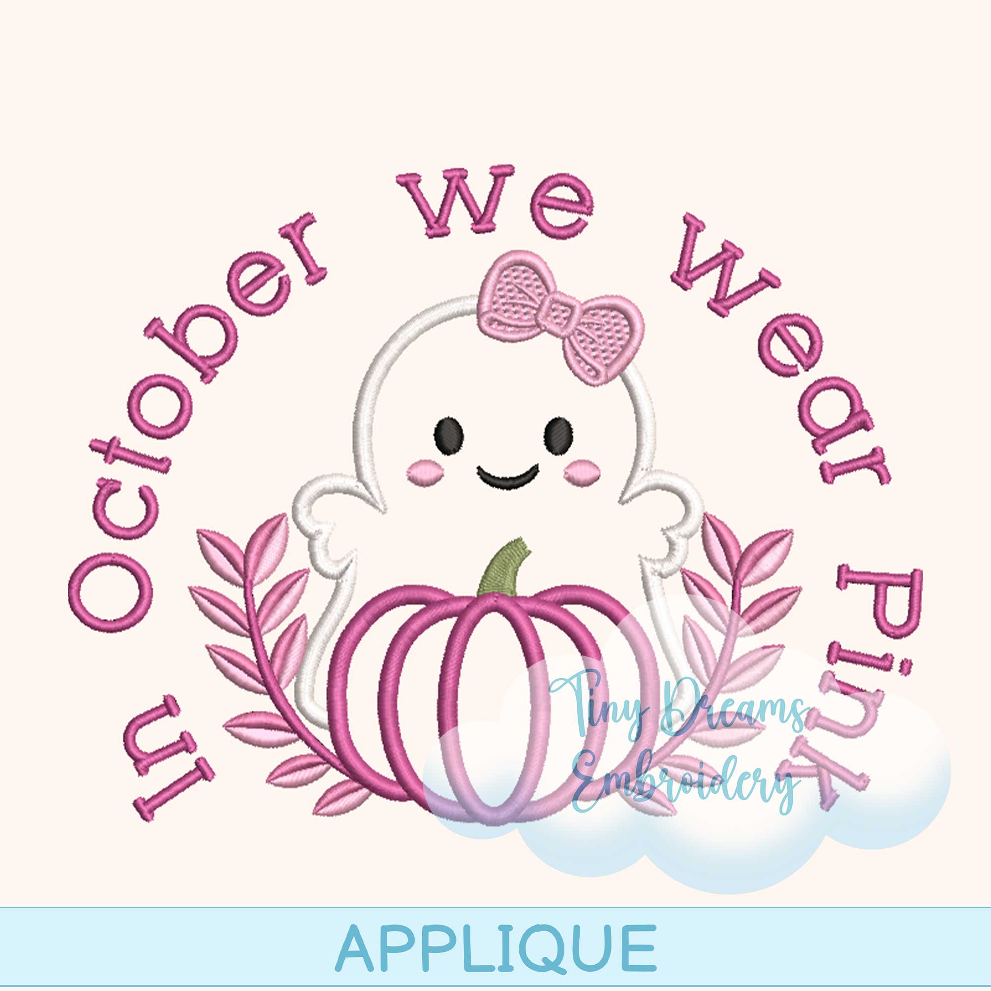 In October Wear Pink Ghost Applique Breast Cancer Pumpkin Halloween Embroidery (Digital Download)
