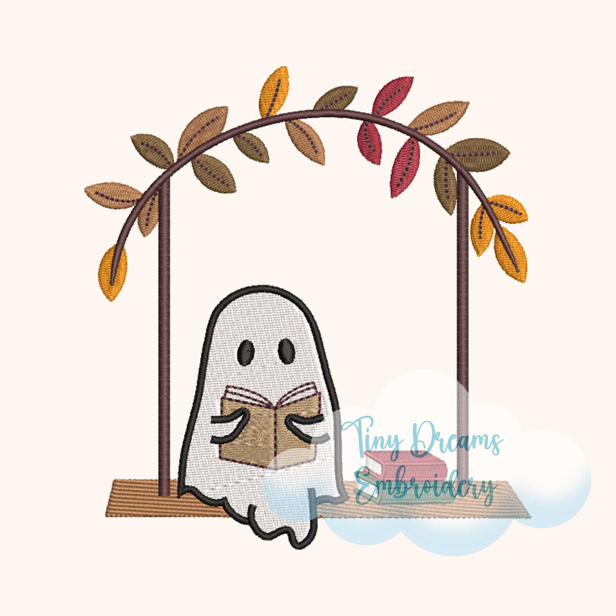Halloween Ghost Reading Swing Fall Autumn Leaves Embroidery Design: Fall Autumn Book (Digital Download)