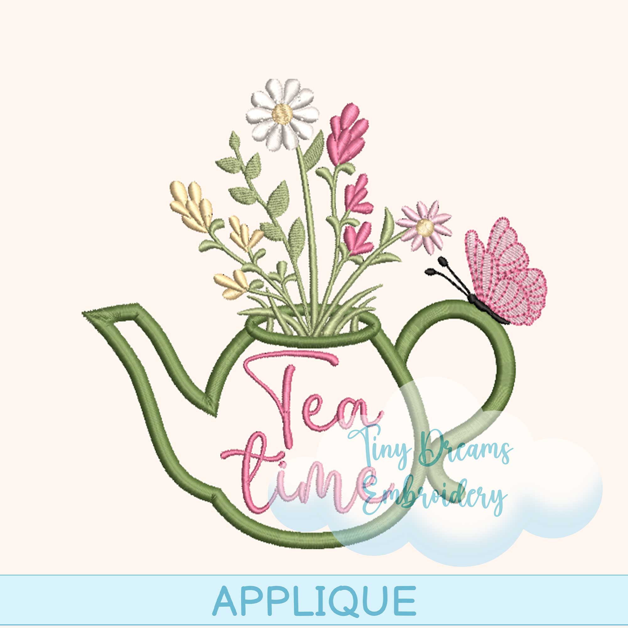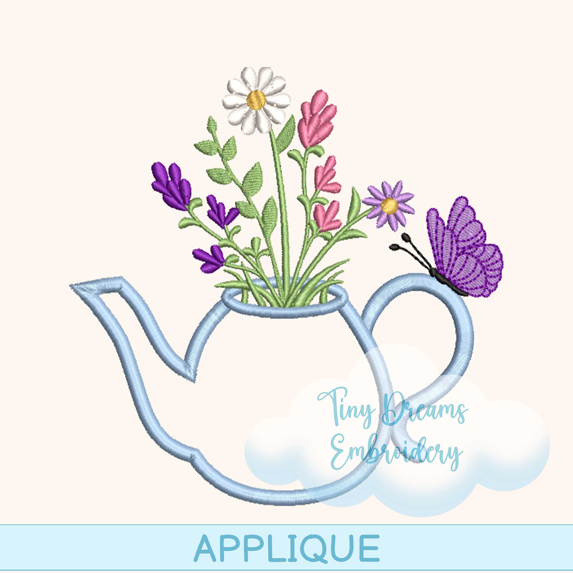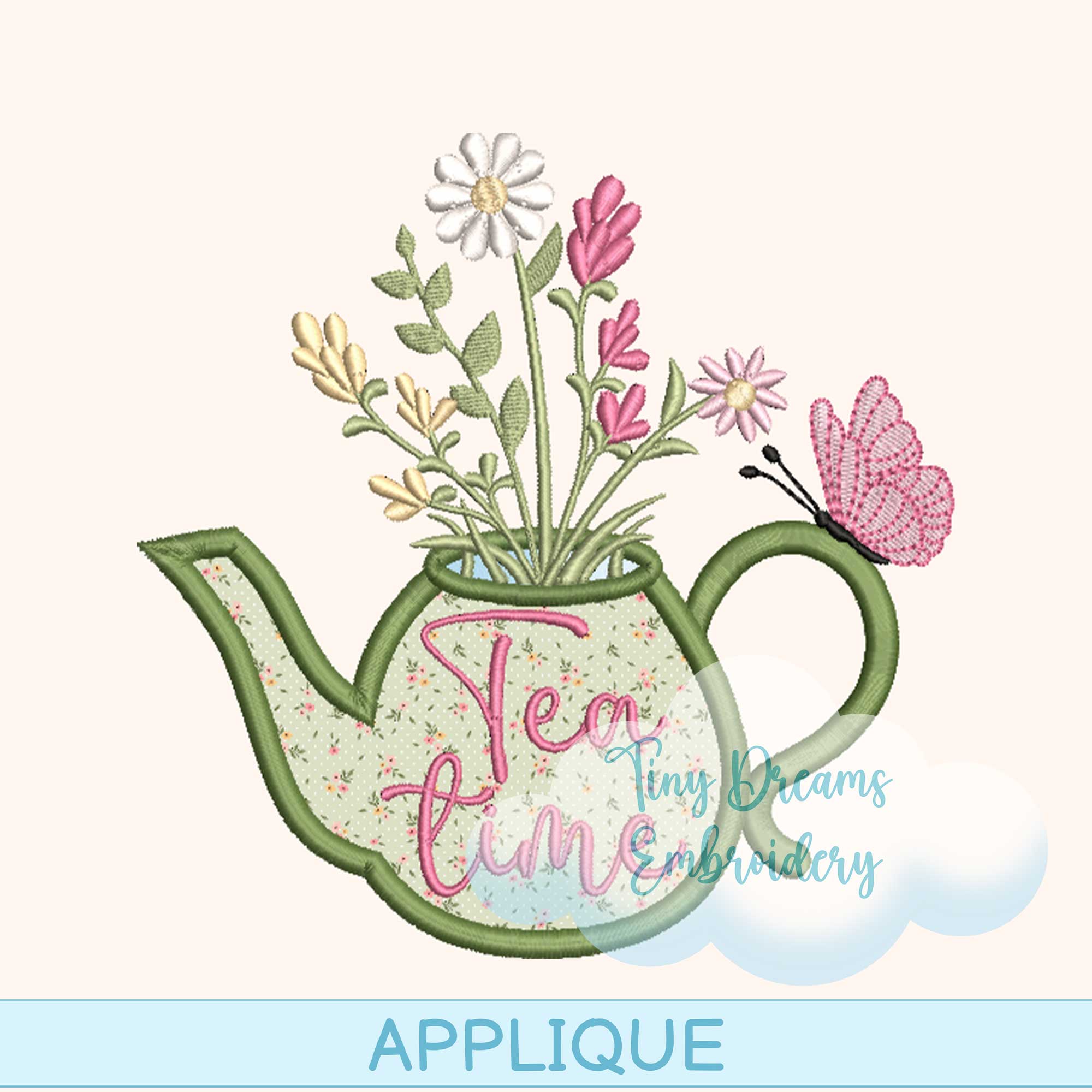Tea Time Teapot Floral Applique Digital Machine Embroidery Design Flower Spring Embroidery Design Applique Butterfly Daisy Embroidery Tea